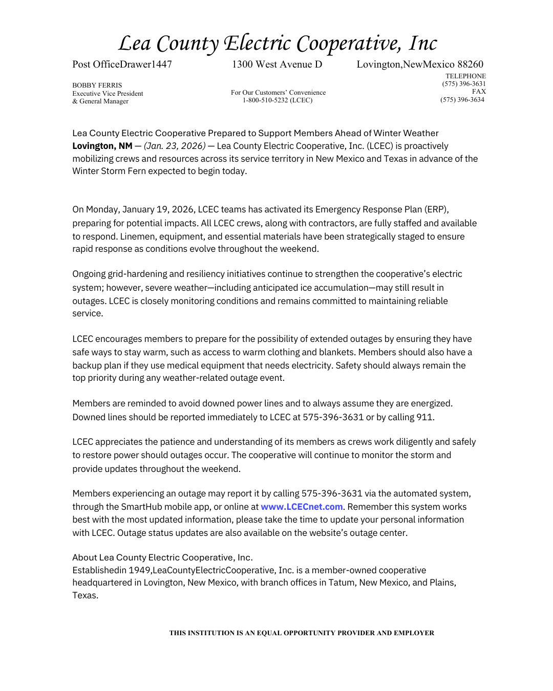 Lovington, NM, November 30, 2020– - Lea County Electric Cooperative (LCEC) lobbies will remain closed due to the current Governor’s Executive Orders. We want to ensure our members that the Cooperative is taking all of the necessary measures to keep our employees and members safe as the COVID-19 pandemic continues.