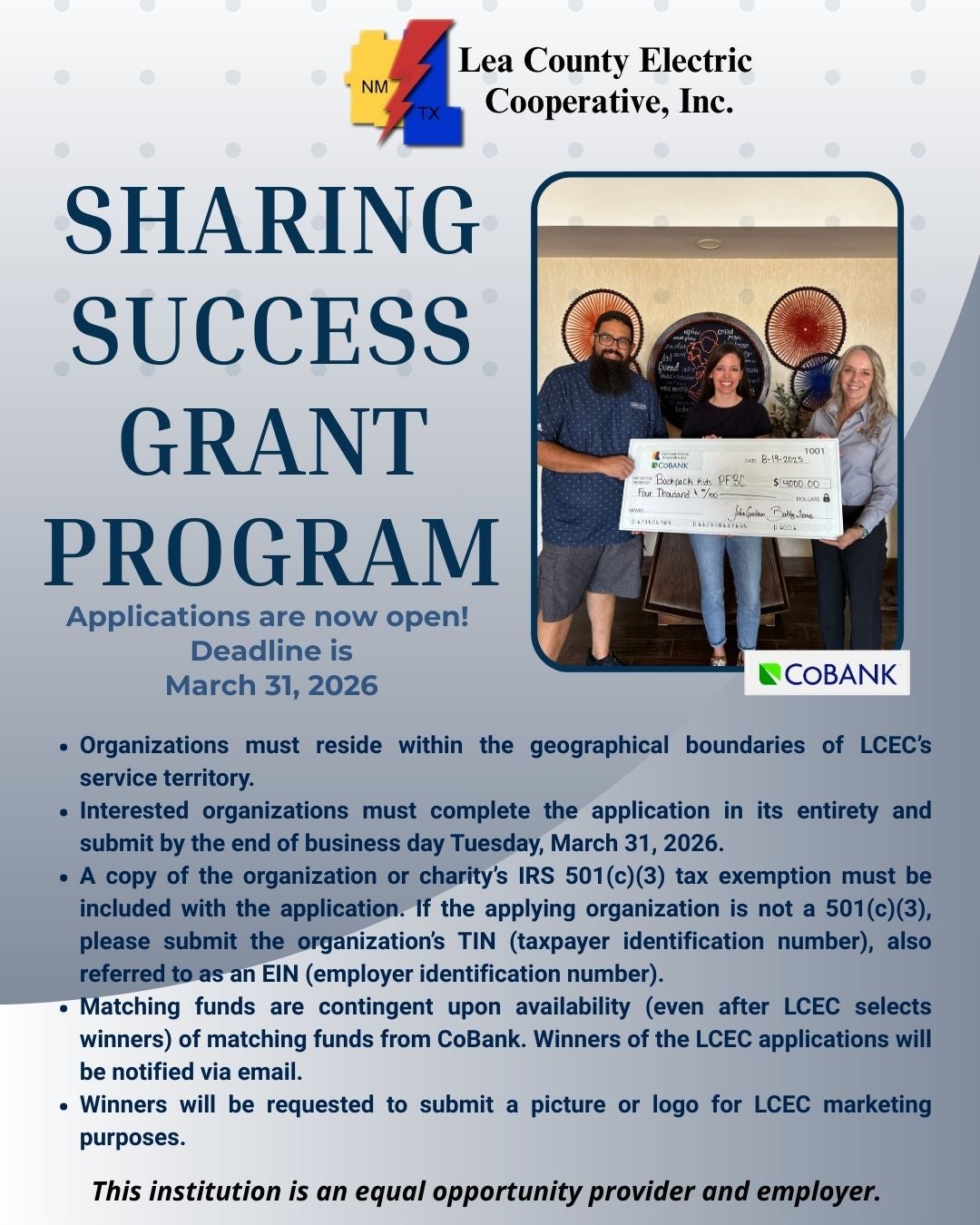 Lea County Electric Cooperative's board of trustees and employees are proud to announce the continued partnership with CoBank. We remain committed to helping build more vibrant rural communities and shared success.