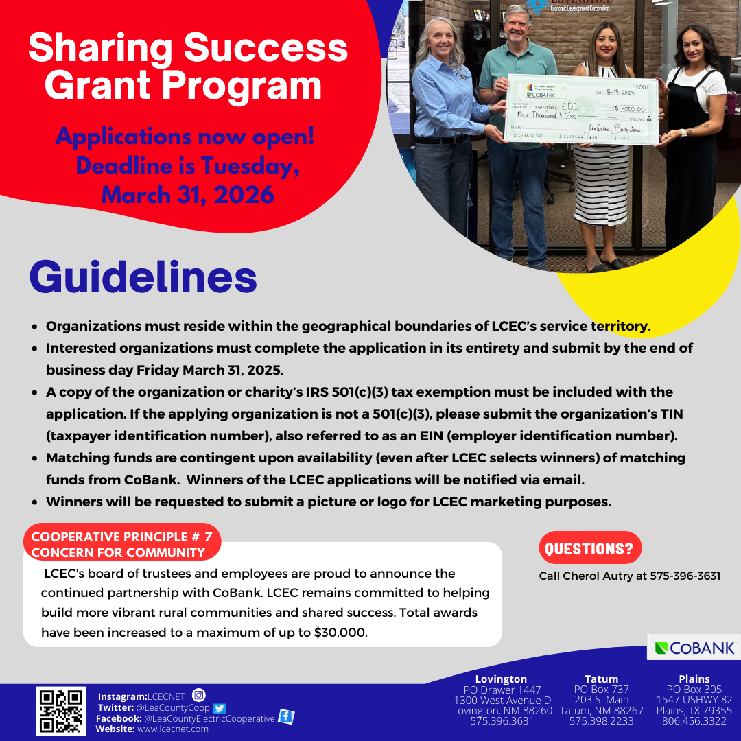 Lea County Electric Cooperative's board of trustees and employees are proud to announce the continued partnership with CoBank. We remain committed to helping build more vibrant rural communities and shared success.